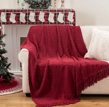 A cosy deep-red throw blanket that adds instant warmth, texture, and festive charm to any sofa or armchair.